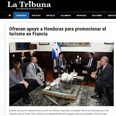 Le quotidien national La Tribuna s’est fait l’écho de ma visite au Congrès et de mes discussions avec les députés Antonio Rivera Callejas (vice-président du Congrès) et Óscar Álvarez (président du groupe du Parti National), plus particulièrement sur le thème de la promotion du tourisme.