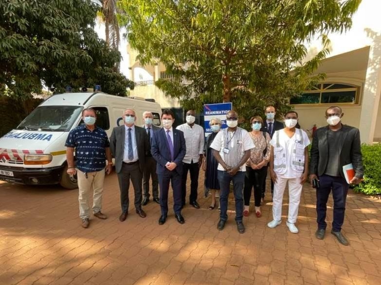 Visite du Centre Médical International avec François Zougmoré, président de l’Association international de santé (AIS), les conseillers des Français de l’étranger : Martine Voron ; Françoise L’étang Yaméogo et Ousmane Ouédraogo ; le consul général Eric Belotti, le conseiller régional Santé Mondiale P-A Rubbo ; les membres du bureau de l’AIS et le personnel soignant.